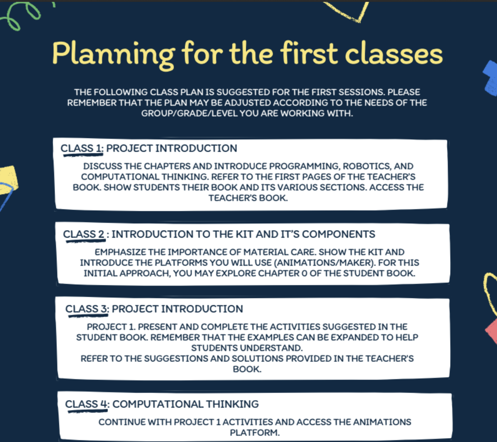 Access all the resources to teach your class, the solution guides, the completed projects and the technical specifications of the kit.